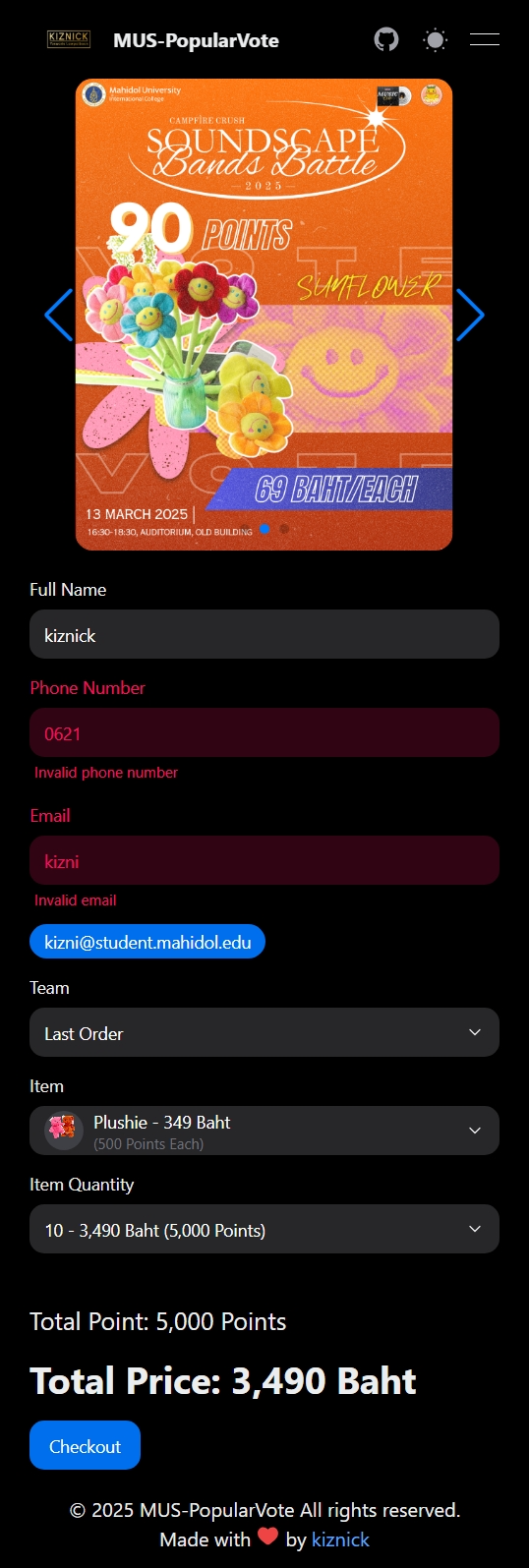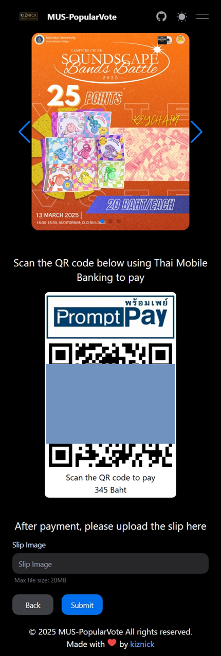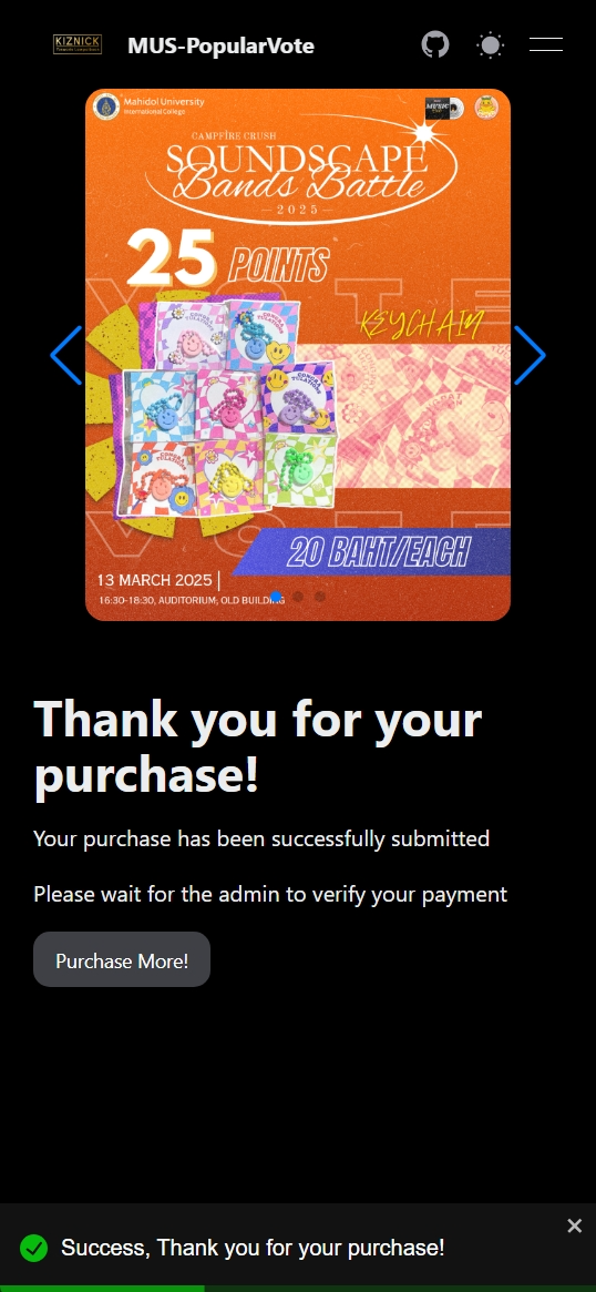MUS-Popularvote is a dedicated web platform built for event competitions, enabling participants to purchase items to support their favorite teams. It streamlines the purchase process, ensures secure payments via PromptPay, and delivers real-time updates to both users and event admins.